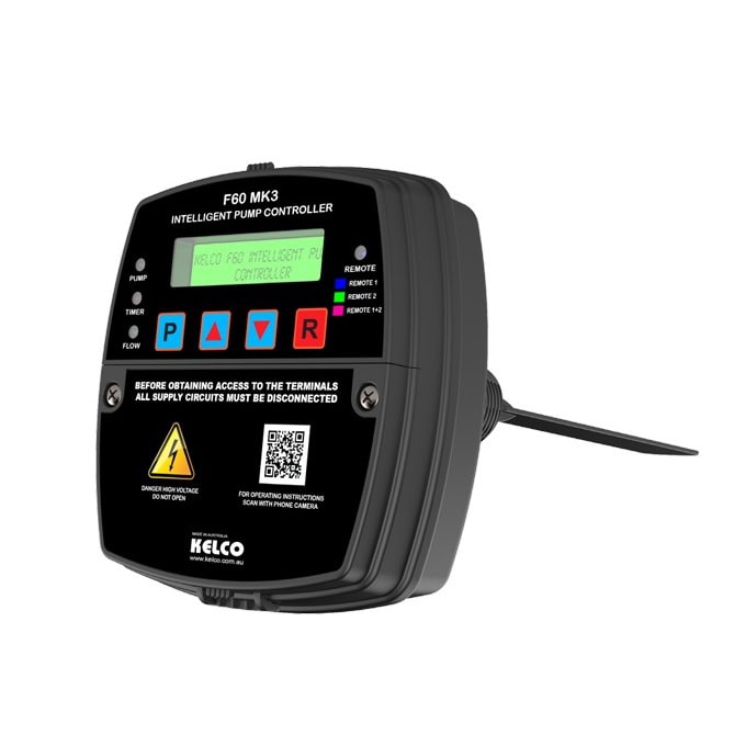 Kelco F60 pump controller, pipe or top mounted, has inbuilt paddle flow switch and can run single phase motors up to 2.4kw