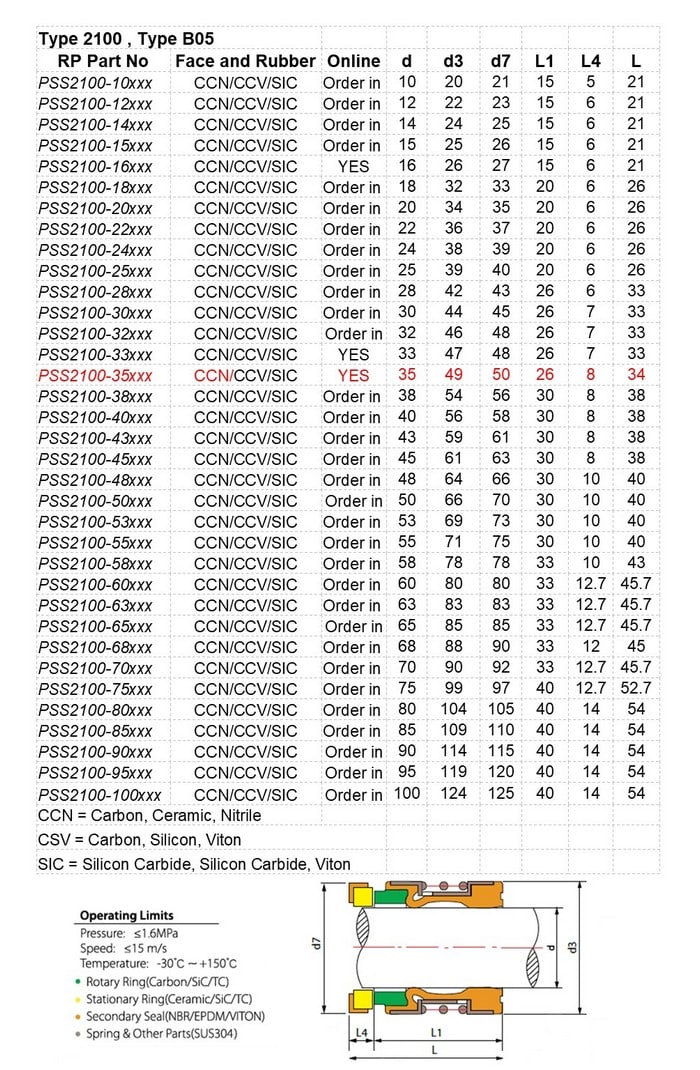 Equivalent to Davey 48816SP, pump mechanical seal Type 2100 Type B05 to suit 35mm shaft with Nitrile Rubber seals and Carbon Ceramic faces