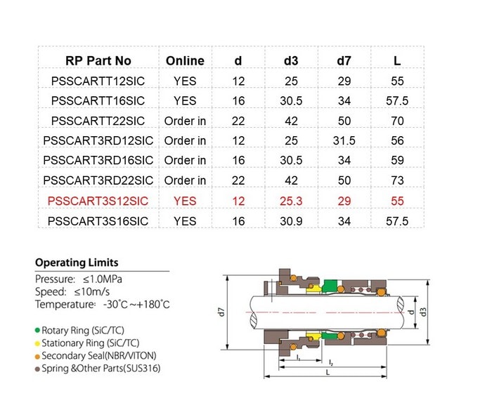 Equivalent to Davey part 303011071206-G3, pump mechanical seal cartridge type, 3 screw housing to suit a Davey VM or Grundfos CR/CRE vertical multistage pump with a 12mm shaft. Has Viton rubber seals and Silicone Carbide faces.