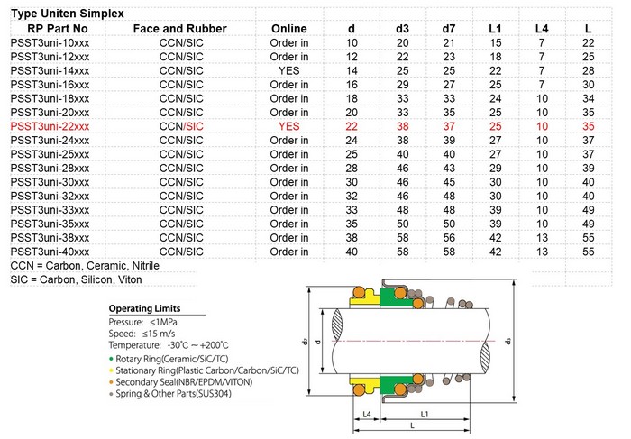 Equivalent to Davey 404125, pump mechanical seal Type Simplex /Uniten type 3 to suit 22mm shaft with Nitrile Rubber seals and Silicone Carbide faces