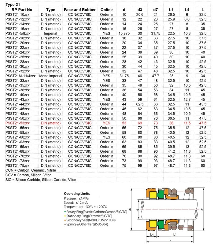 Equivalent to Southern Cross XMS053V, pump mechanical seal Type T21 to suit 53mm shaft with Viton rubber seals and Silicone Carbide faces