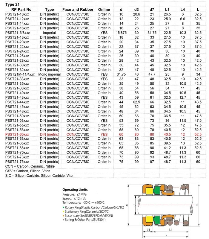 Equivalent to Southern Cross XMS060K/Davey 49553SP, pump mechanical seal Type T21 to suit 60mm shaft with Nitrile Rubber seals and Carbon Ceramic faces