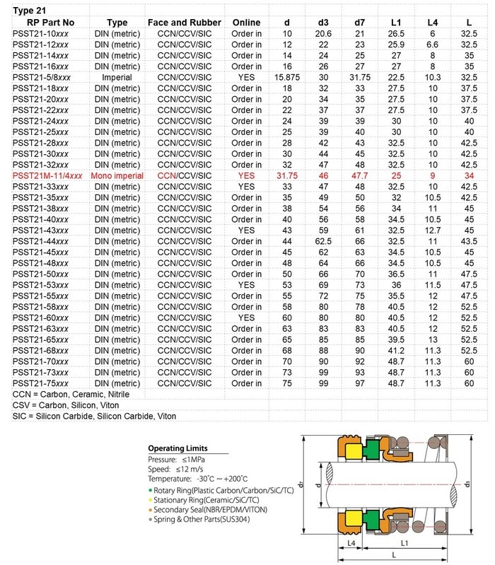 Equivalent to Mono M032138A, pump mechanical seal Type T21-Mono (short) to suit 1 1/4″ shaft with Nitrile Rubber seals and Carbon Ceramic faces