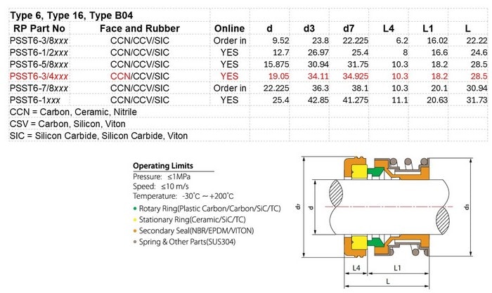 Water Pump mechanical seal Type 6 Nitrile Rubber seals Carbon Ceramic faces to suit 3/4″ shaft equivalent to a Davey 48803SP