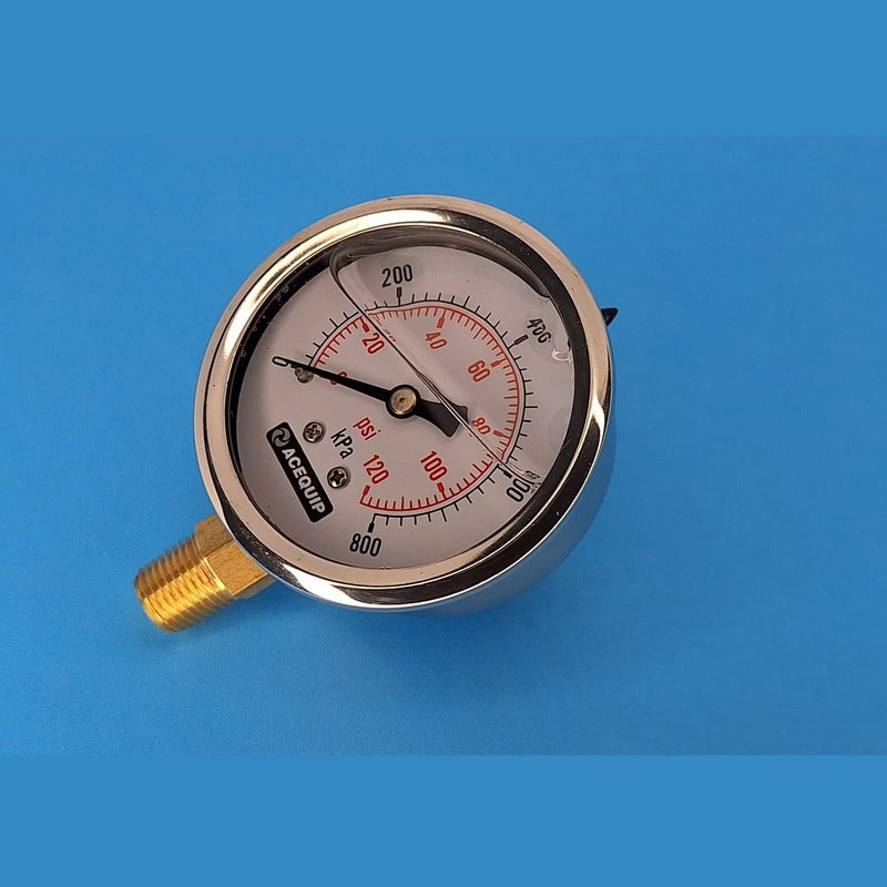 Pressure Gauge 63mm glycerine filled, stainless case, Lower Mount, 1/4”Bsp 0-800Kpa