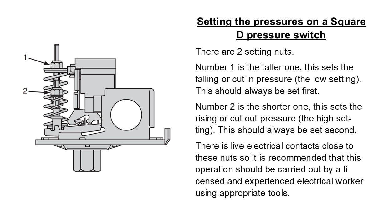 Square D brand adjustable pressure switch. This super reliable, high quality switch suits a pressure range of 25-80PSI (170kpa -550kpa).